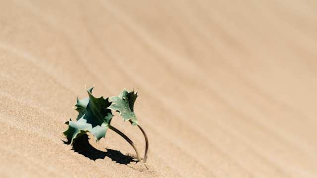 A close up view of a holly leaf in the sand at Santa Maria Beach, Paros, Greece