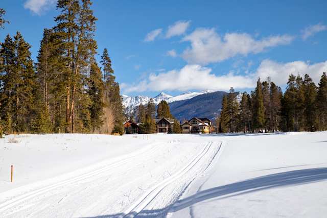A snowy trail leading to a ski resort by mountains in Keystone, Colorado, USA