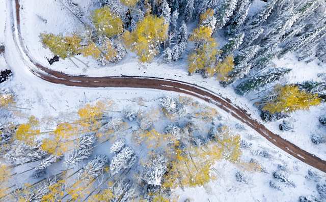A bird's eye view of a road and green trees running through a snowy area, Telluride, Colorado, USA