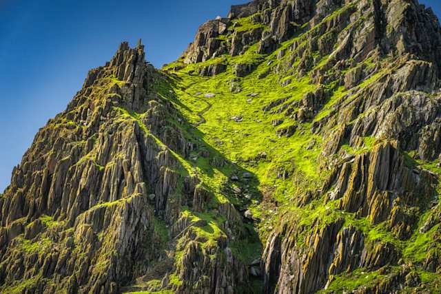 A close up view of a steep green section of Skellig Michael where Star Wars was filmed
