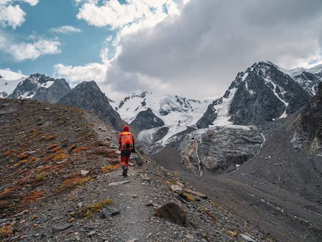 A solo traveller hiking through snow-capped mountains