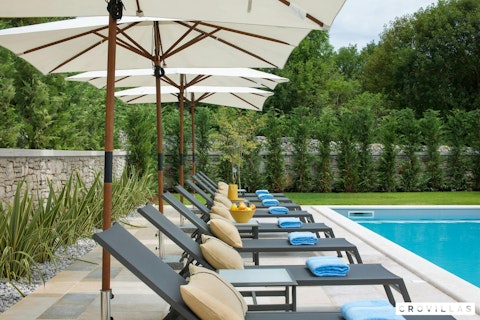 Experience a dream vacation by the sea at this home, an individual and modern Croatian villa with inviting architecture and a stylish setting. The villa features several covered terraces and a balcony that offer distant sea views. Relax in the light blue shimmering pool with hydromassage, surrounded by comfortable loungers and well-kept gardens. Enjoy meals at the dining table and brick barbecue while admiring the evening sun. Shared amenities include two tennis courts, soccer goals, volleyball net, handball, basketball hoops, bocce courts, children's playground, outdoor fitness, and a table tennis table. The classic yet elegant interior style combines harmoniously with ample space for dignified relaxation in the living room with an open fireplace and sofas. The four double bedrooms each have an en-suite bathroom and provide an exceptionally cosy ambience for deeply relaxing vacation nights. The home is particularly versatile and all-around chic option for demanding active vacationers.