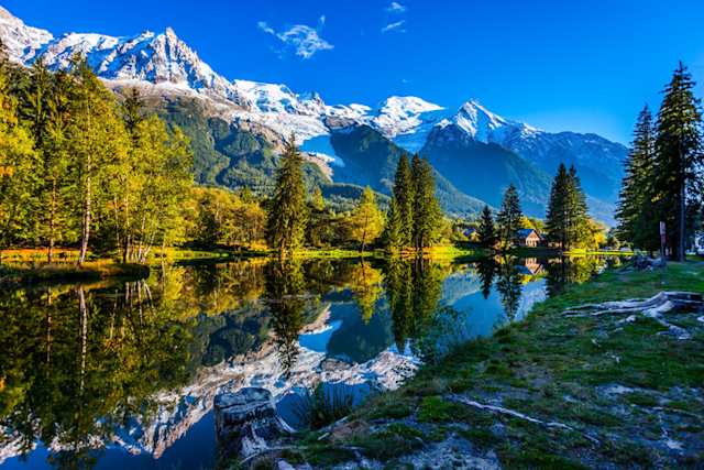 A view of the Alps mountains and green trees reflecting in a lake, Chamonix, France