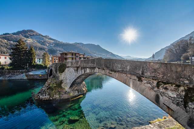 Sun shining above the ancient San Nicola Bridge over the Brembo River in San Pellegrino Terme