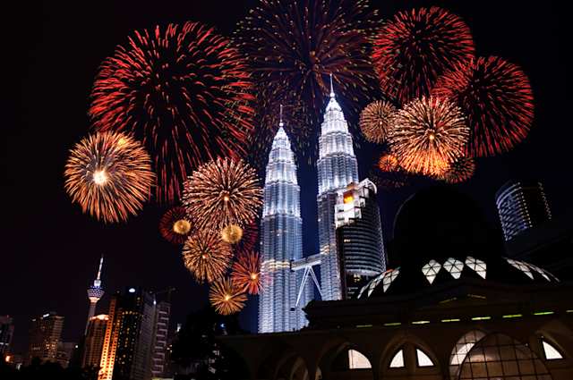 Two skyscrapers illuminated at night with fireworks in the dark sky, Kuala Lumpur, Malaysia